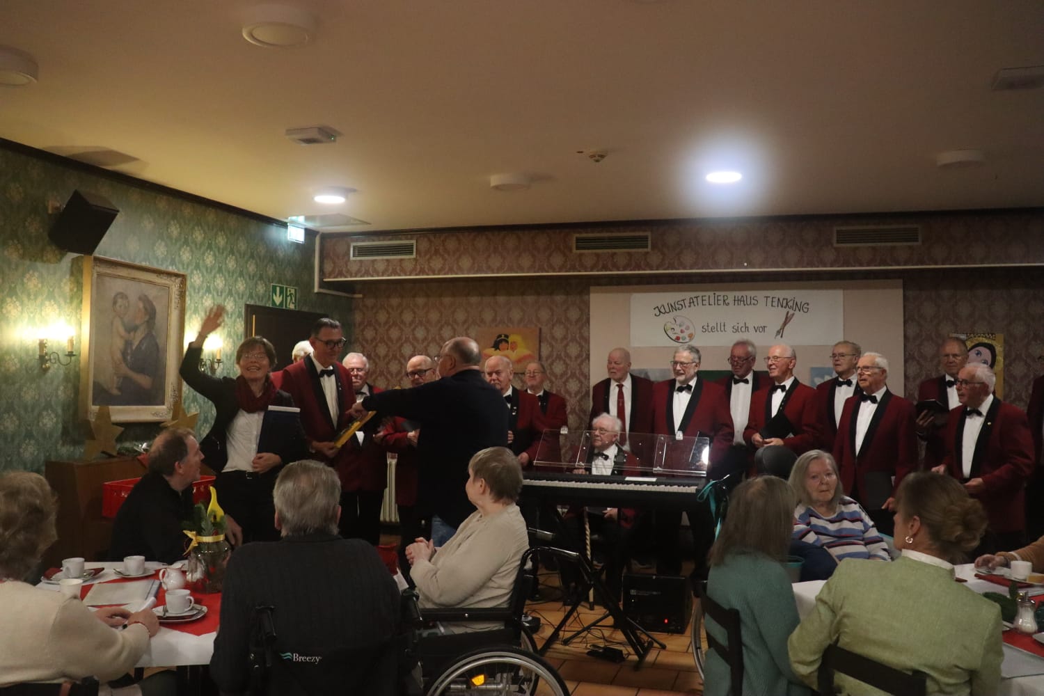 Wie schon oft waren wir wieder am 1. Mittwoch im Dezember eingeladen, mit den Bewohnern von Haus Tenking Advent zu feiern. Aber diesmal war es etwas anders, viel lockerer. Das fing schon beim Einsingen im „Rittersaal“ an, Monika hatte alle Lieder gut mit uns eingeübt, wir hatten genügend Zeit, keine Hektik. Dann kam sie auf die Idee mit dem „Mini-Flashmob“: Nachdem Adalbert und Ludger im „Herzcafé“ das Piano aufgebaut hatten, ging Monika hinein und fing an zu spielen, die Sänger kamen in kleinen Gruppen herein und wir sangen dabei „Kling, Glöckchen, klinglingeling“. Dann ging´s im bunten Wechsel weiter: Mal sang der Chor ein mehrstimmiges Lied, dann wurden die Bewohner mit einbezogen. Einige äußerten auch lautstark ihre Liedwünsche, wünschten z.B. „Halleluja“, Monika stimmte sofort an „Ein Stern stand am Himmel“ mit dem Refrain „Wir singen Halleluja ..“