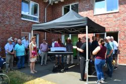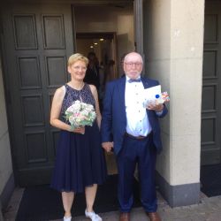 Im Anschluss an den Gottesdienst hatten Sofia und Gustav alle Mitfeiernden zu einem Sektempfang eingeladen. Wir haben beide vor der Kirche mit Spalier und dem musikalischen Glückwunsch „Wir wünschen euch viel Segen“ empfangen. Gestärkt durch kühles Nass haben wir dann auch noch „Ein Bier“ präsentiert, sicher auch zur Freude des Jubelpaares.