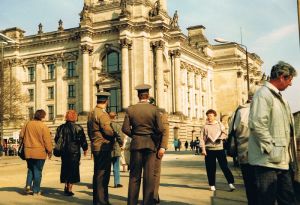 Ein Stadtrundfahrt brachte uns durch Westberlin zum Sitz der „4-Mächte“, zum Charlottenburger Schloss, durch den Stadtteil Tiergarten zur Siegessäule, zur höchsten Erhebung „Kreuzberg“, zum Polenmarkt, zum Reichstag und zur noch bestehenden Rest-Mauer, die von einigen „Klettermaxen“ begangen wurde. Das eröffnete den Blick auf den Reichstag, vor dem immer noch Volkspolizisten patrouillierten. Lächeln war schon erlaubt!