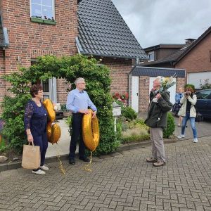 Am 10. Juli war es bei Annegret und Ludger Grunden soweit, auch sie beide Sänger im Kirchchor Herz Jesu. Da waren die Bestimmungen gerade etwas gelockert. In der Gemeindemesse sang ein kleines Ensmble „Sancta Maria“ und „Frieden sei dieser Welt beschieden“. Für den Nachmittag hatten sich mehrere Sangesfreunde aus ihren Chören verabredet, den Beiden wenigstens zu gratulieren. „Wir wünschen Euch viel Segen auf allen Euren Wegen“ sangen sie im Kanon mit Corona-Abstand und überreichten einige Aufmerksamkeiten. Elisabeth und Ludger brachten die Zahl 50 als goldfarbene Luftballons, die von den Kindern und Enkelkindern als zusätzlicher Schmuck am Haus befestigt wurden. Der „Tutemann“ gratulierte auf Plattdeutsch und informierte die Nachbarschaft über das Ereignis. Vorsitzender Herbert Veith wünschte im Namen des Männerchores mit einem Blumengebinde viele Glück, und Kassenwartin Irmgard Decressin überreichte ein Album mit Bildern und Glückwünschen der Chormitglieder von Herz-Jesu.