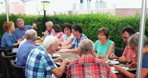 Ein plötzlich aufkommender Regenschauer überraschte Rüdiger Düking und seine Gäste.Das leckere Grillessen mit gemütlichem Beisammensein wurde aufgeteilt auf draußen unter den Sonnenschirmen und drinnen im schnell dafür hergerichteten großen Saal. Tat der guten Stimmung und den vielen netten Gesprächen untereinander (fast) keinen Abbruch, und der allgemeine Aufbruch fand erst um 21.00 Uhr statt.