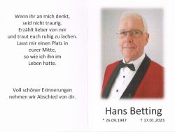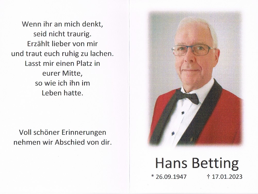 Sechs-Wochen-Gedenken für Hans Betting am 2. März