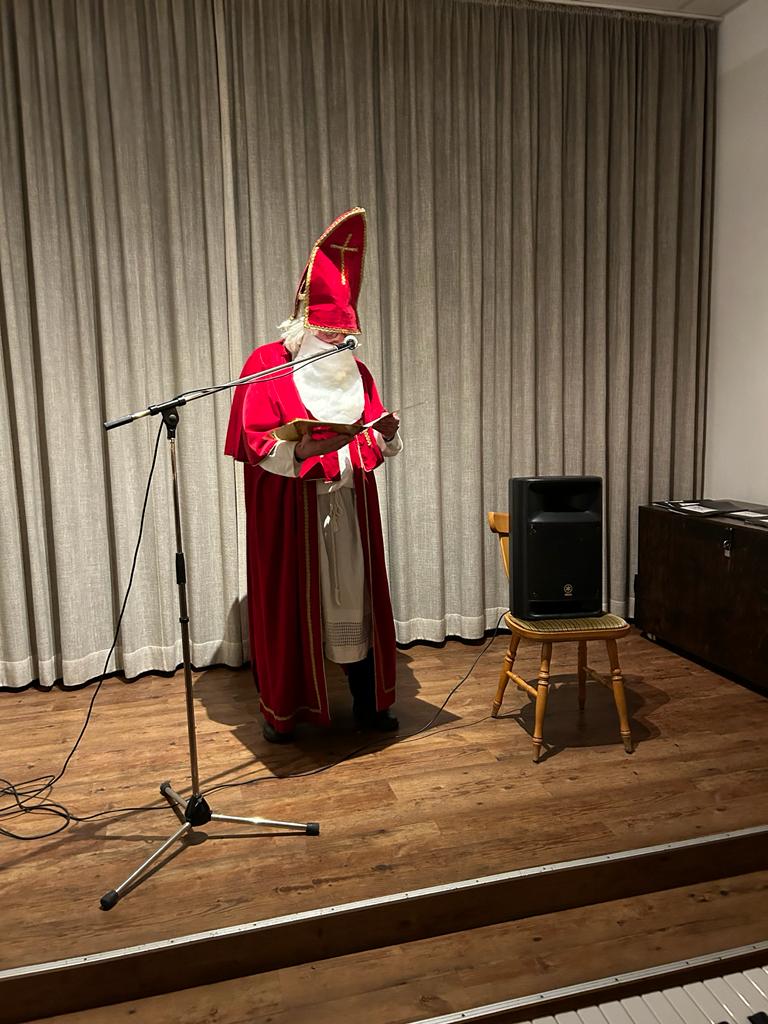 Der Nikolaus kam mit seinem Goldenen Buch, aus dem er viele Gedanken vortrug, die ihm zum Chor gekommen waren. Er lobte Monika und Ludger, die „für jeden von uns eine eigene Audiothek geschaffen haben.“ Auch der Führungswechsel von Herbert zu Markus war ihm bekannt, er erklärte ihn als „gut so“. Andererseits beklagte er Krieg, Hass und Zerstörung in der Welt, aber: „Wir setzen ein Neugeborenes dagegen, das soll der Welt den Frieden in Liebe geben.“